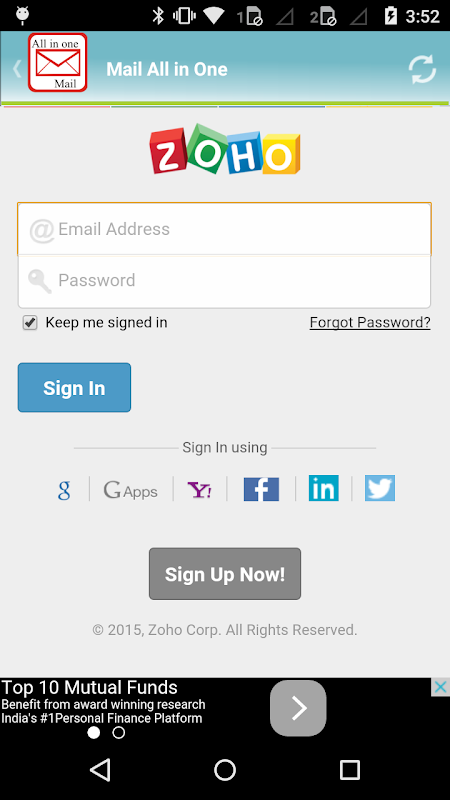 Mail All in One is a must have app for all E-Mail ,Mail users. As its name suggests it contains all popular mail provider sites and one can access his/her favorite mail media such as Gmail , Hotmail, Zoho etc. through this app.