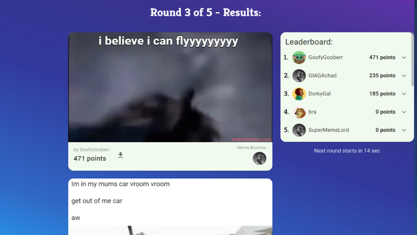 通常:各プレイヤーはランダムなミームを受け取り、そのテキストを考える必要があります。その後、プレイヤーはお互いのミームを評価し、ミームバディを授与します。最も多くのポイントを集めた人が勝ちます。