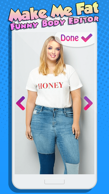 ルック脂肪 fat body makerに感謝します! 新しい「 私を作る脂肪 ボディエディタ 」をご覧ください 写真ステッカー付き。 「 body shape photo editor」を開いて、新しい外観を取得します。 写真を撮り、フォトエディターでステッカーを使って修正します。 このbody shape editor for womenを使用して素晴らしいフォトモンタージュを作成してください! あなたが太って見えるようにするためのフォトエディタのおかげで、完全な体の変化を達成します。 ルックぽっちゃりにすべてのあなたの写真への写真のステッカーを適用します。 十分に勇敢になり、 fat body cameraを使用してください! これで、まったく別の人のように見えるようになります。 バーチャルbody shape changerを入力し、slim to fat photo editorの助けを借りて少なくとも1日は太ってください!