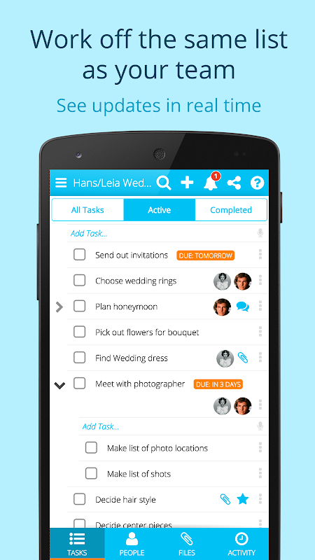 • リアルタイム コラボレーション - チームの他のメンバーと同じタスクを表示します。チームの全員が、タスクが更新され、チェックオフされたことをリアルタイムで確認できます。