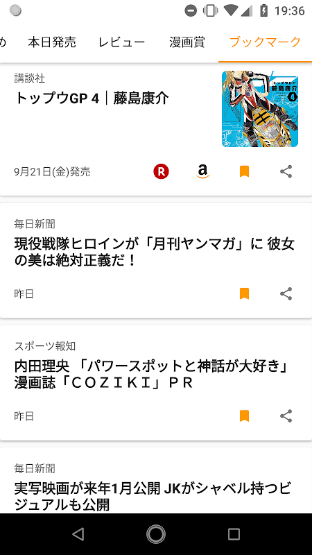 追加したブックマークは、右上にある「ブックマーク」タブをタップすると、ブックマークした漫画ニュースの一覧が見られます。
