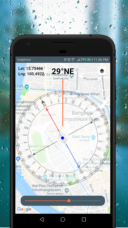 アプリは地図上のあなたの位置にコンパスを示しています。 地図は常に北を向きます。このようにして、実際の生活の中で目の前に見えるものが携帯電話の地図と一致するようになります。