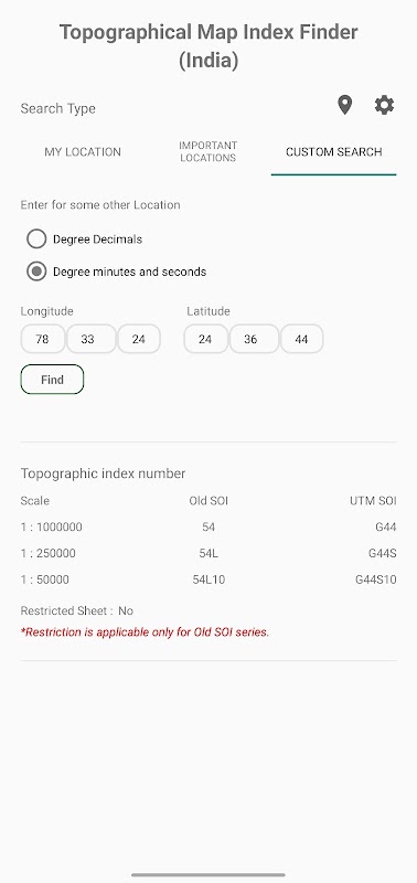 アプリは、3つの異なるスケールで、インド内のすべての場所のための旧シリーズと新シリーズの地形シートの番号を見つけます