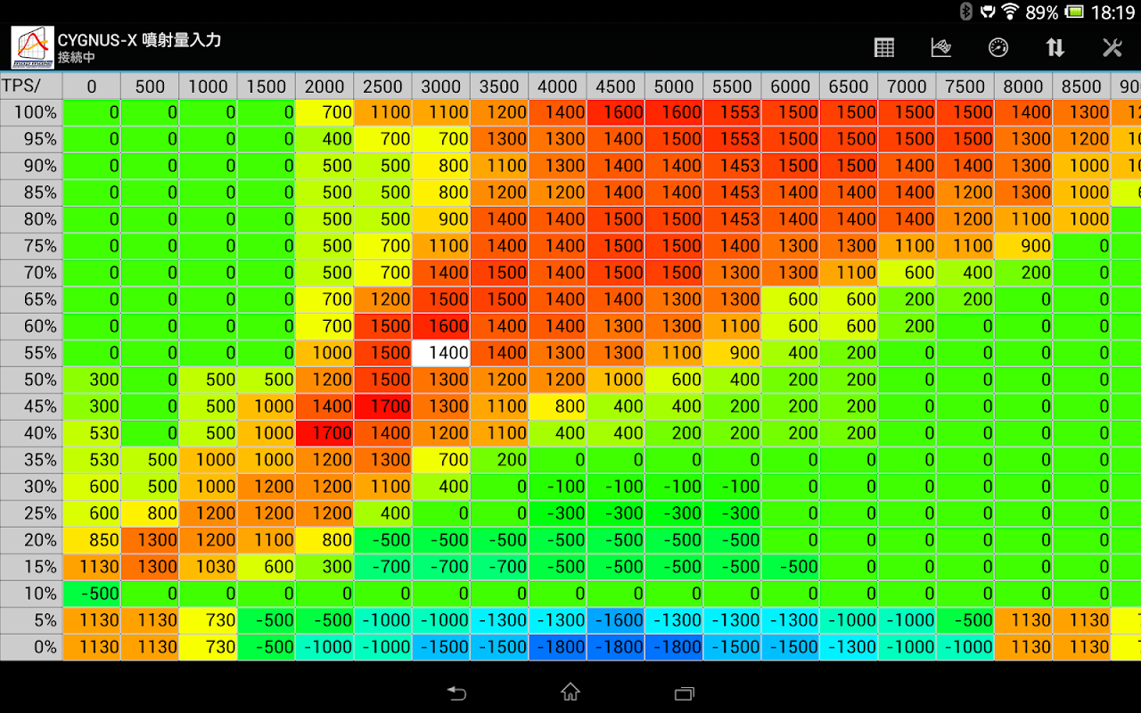 ・燃料噴射増量/減量をエンジン回転・スロットルポジション毎に最大2500μSで
