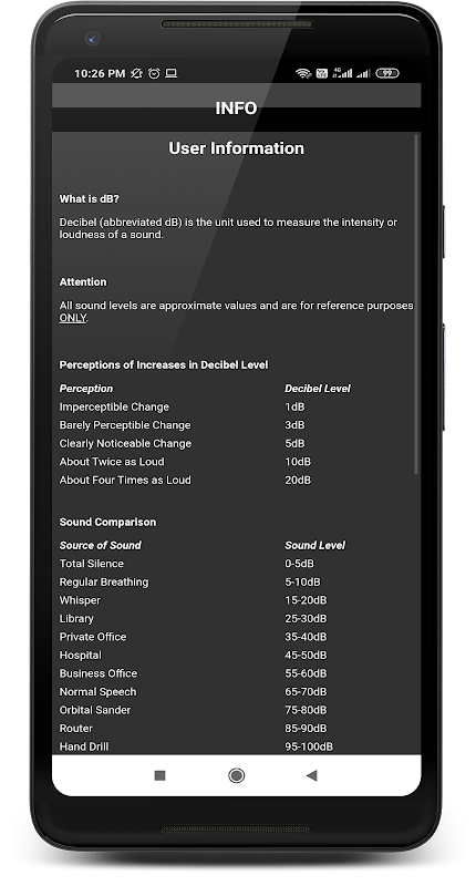 ユーザー情報ガイドには、音の知覚と許容可能な騒音レベルの暴露に関する有益な事実、および音レベルの比較参照チャートが含まれています。