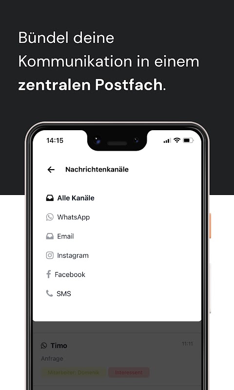 Mateoアプリでは、WhatsApp Business API、Facebook、Instagram、SMS、Eメールなどのすべてのチャットをバンドルしています。これにより、顧客とのコミュニケーションの概要が一目でわかり、時間を節約できます。