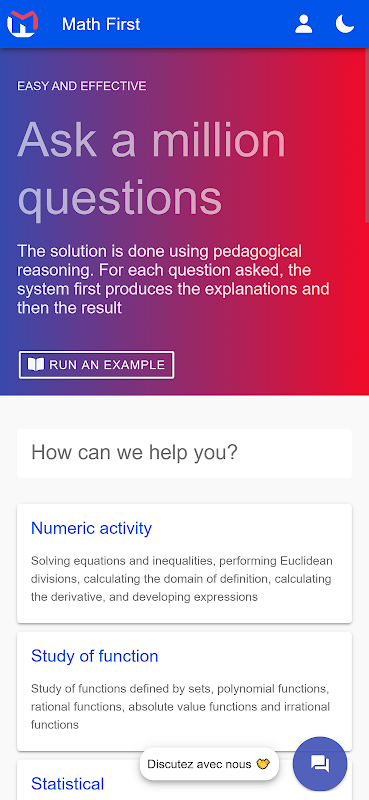 MathFirst は、数学の生徒を支援する 4 つの自動処理モジュールと、学習者が数学、物理学、化学、SVTEEHB (地球科学) の学術レベルに合わせた演習やソリューションにアクセスできるようにする 5 つ目の対話型チャットボットを含む 5 つのモジュールで構成されています。フランス語、英語など。