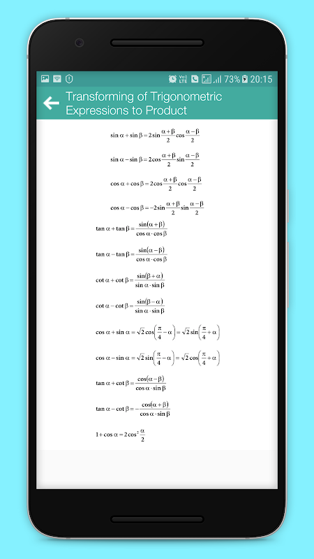 Yod don't need to make any paper notes to remember mathematics formulas you only need to install this app to have all formulas on your phone.