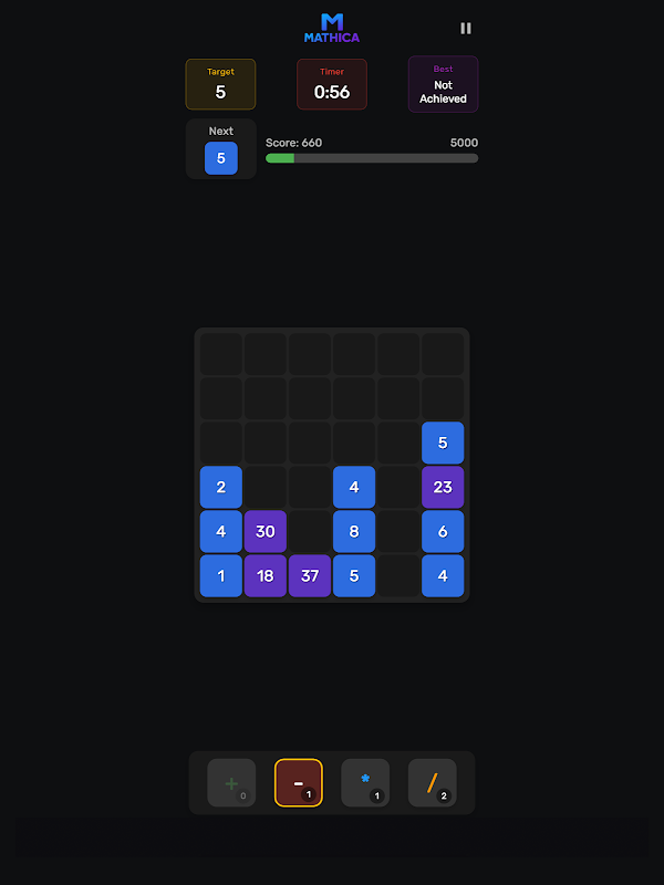 Mathica は、ブロック落ちゲームの興奮と数学パズルの知力チャレンジを融合させたゲームです。数字を選択し、演算(+、-、/)を適用してターゲットをヒットさせ、ボードをクリアしてポイントを獲得しましょう。