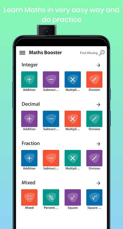 Maths Booster is and android math learning app in which user can do practice of addition, subtraction, divide, multiply and also can play find missing which have 5000 questions set.