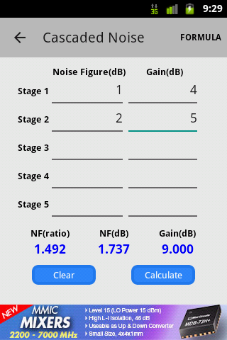 •カスケード雑音指数の場合は、最大5のための雑音指数とゲイン値を入力し、「計算」をタップし、増幅段をカスケード接続し、計算機は、雑音指数(比として及び単位dB)と利得(dB)での累積値を返します。