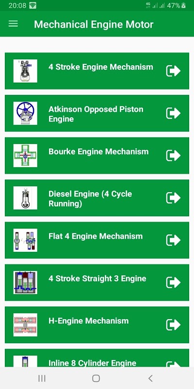 このアプリには、機械式エンジンモーターの動作に関するいくつかのイラスト/アニメーションが含まれています。それらのいくつかの図は次のとおりです。
