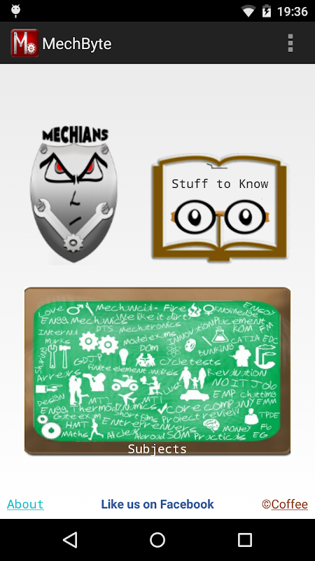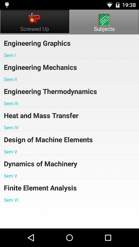 このアプリはまた、機械工学の異なる被験者を示しています。学期単位。被験者はまた、5つの異なるカテゴリーに分類されている(ねじ込みアップ、マッド数学、ドキドキ、スコアと管理)。異なる被験者を処理する方法を決定するのに役立つように、この特定の分類が与えられます。各被験者のためのいくつかの良い本と一緒に異なる被験者-から最も簡単に過酷なを処理するためのヒントが提案されています。