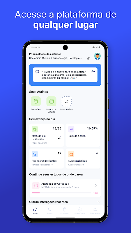 MEDsimpleは、医学部1年生から6年生まで、ENAMED試験対策をしながら学習を加速させ、知識を定着させるための包括的なプラットフォームです。4万問以上の解説付き問題、30万枚以上のフラッシュカード、そして基礎サイクルからインターンシップまで、2,000以上の学習プランをご用意しています。