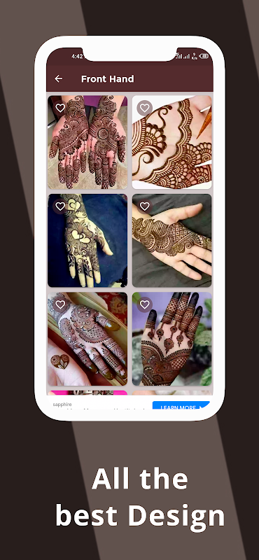 This app contains Mehndi Designs completely offline such as Bridal Mehndi Designs, Eid Mehndi Designs, Diwali Mehndi Designs all Trending Designs of Indian and Pakistani Mehndi ,Finger Mehndi Designs, Kids Mehndi Designs, Back hand Mehndi Designs ,Arab Mehndi. Diffrent categories like Hand Designs, Foot Designs ,Henna Mehndi And tattoos, Henna Patterns.