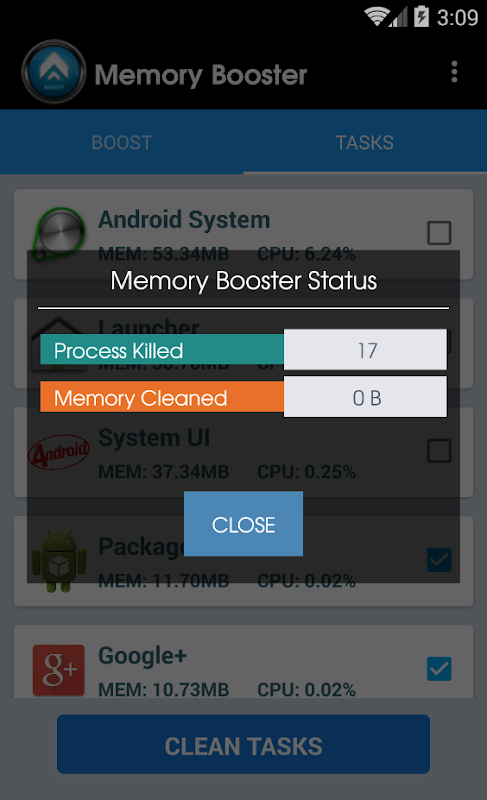 You can boost your RAM with single touch. Touch boost button and clear running process. In Tasks tab you can swipe to clean individual process from ram memory.