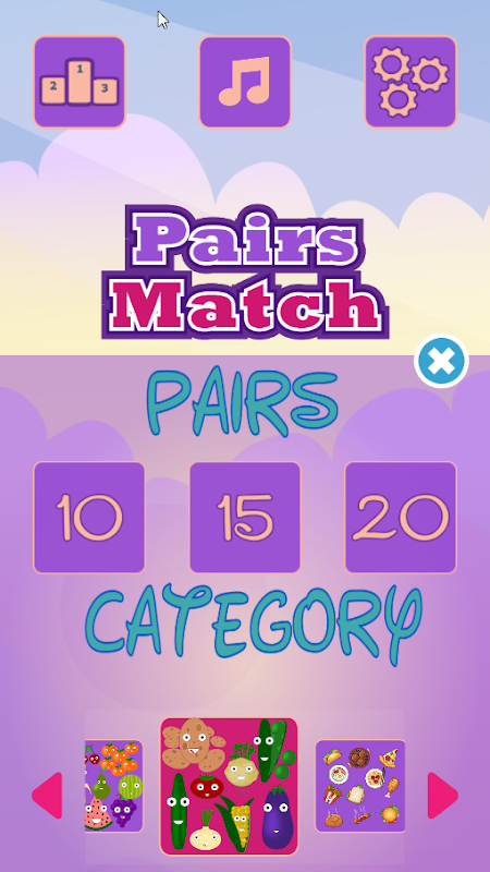 Find two the same pictures among number of others. Choose pictures set fruits or vegetables. Find all pairs in the shortest time.