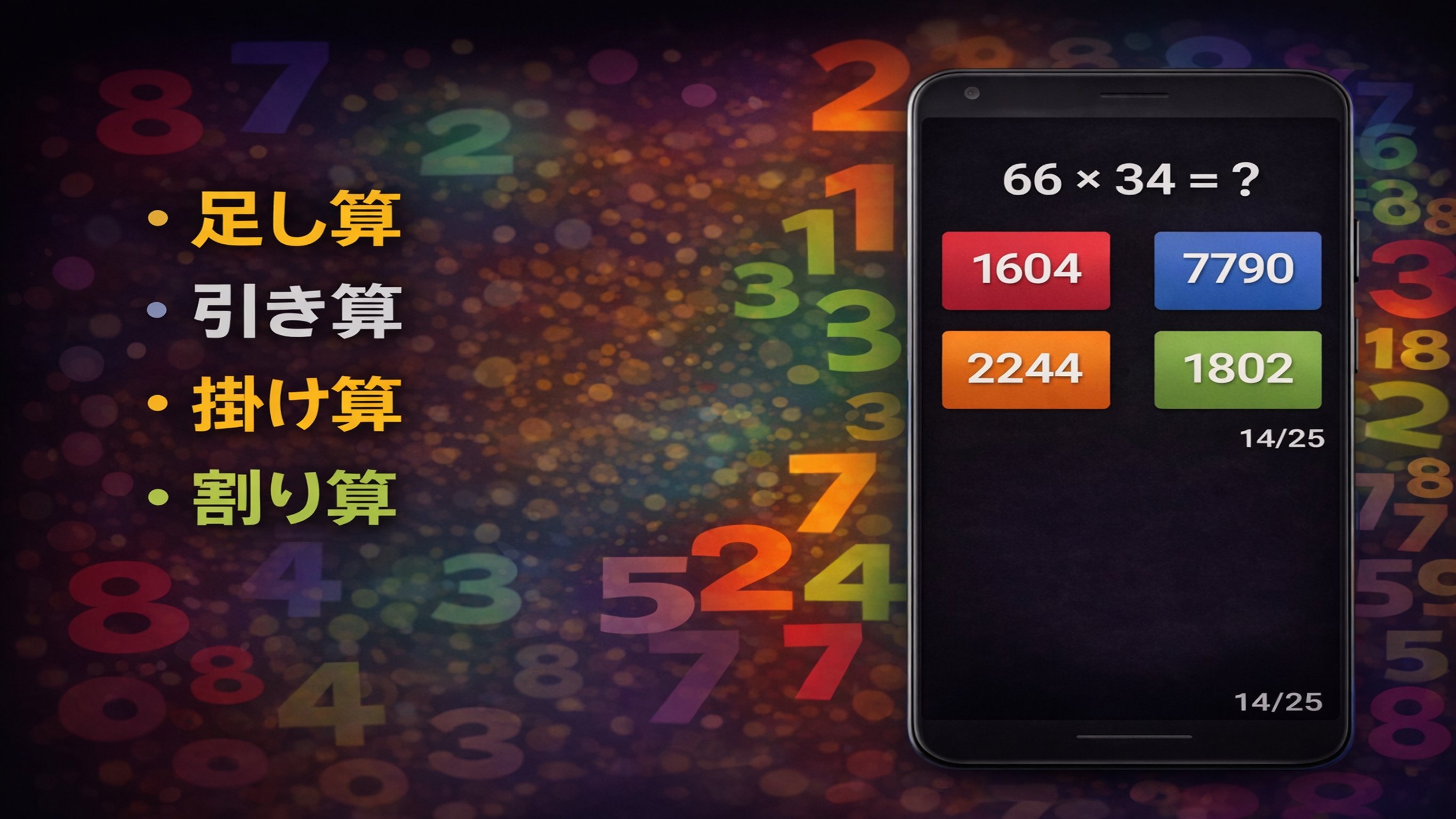 足し算、引き算、掛け算、割り算を使った暗算問題に挑戦しましょう。学生の方から社会人の方まで、脳を活性化させたいすべての人に最適です。
