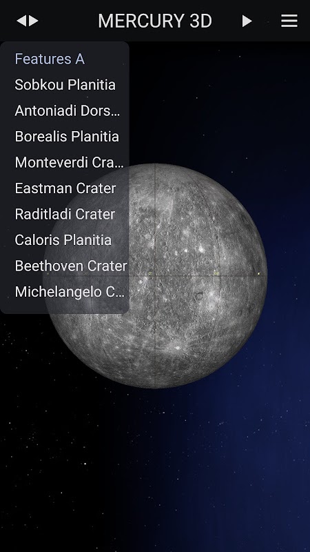 Mercury 3D を使用すると、最も内側の惑星の表面全体を高解像度で簡単に探索できます。最大の平原であるカロリス平原を見たり、主なクレーター、ルペ、斑点を詳しく観察するには、左側のメニューをタップするだけで、それぞれの座標に瞬時にテレポートされます。水星は太陽系で最も小さな地球型惑星であり、地球と同じ岩石体です。ギャラリー、その他のデータ、リソース、回転、パン、ズームインとズームアウトは、この素晴らしいアプリで見つけられるさらに多くのページと機能を表します。