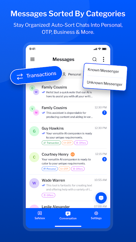 インテリジェントなSMSオーガナイザーが、テキストメッセージを「個人」、「取引」、「ワンタイムパスワード(OTP)、プロモーション」に自動的に分類します。このスマートメッセージングアプリケーションは、最も重要なメッセージを常に目立たせます。