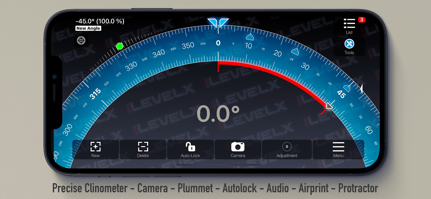 スマートフォンのすべての縁に沿って角度を測定する傾斜計を使用。画面上で指を動かしての目標角度設定可。さらに、角度一覧には角度を最大5つ保存し、目標角度としてすぐに呼び出せます。