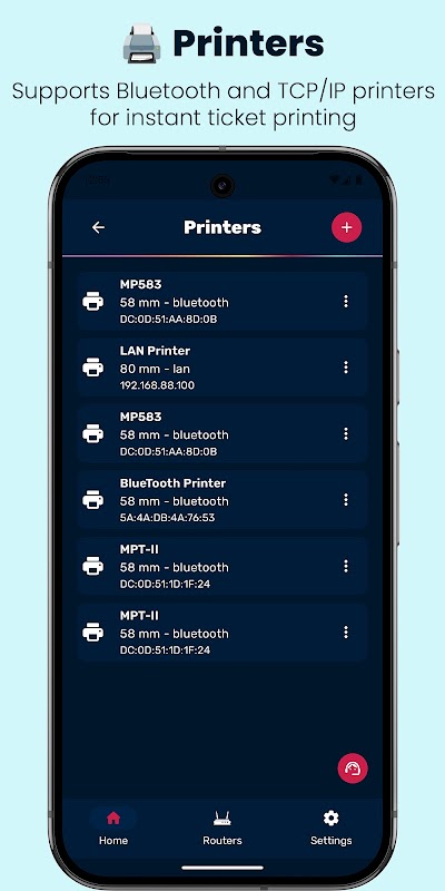 BluetoothおよびTCP/IPプリンターをサポートし、チケットを即座に印刷できます。