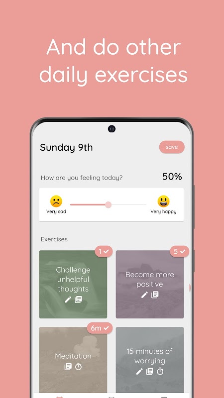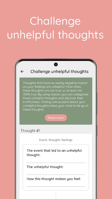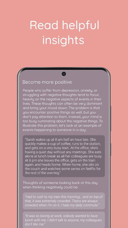 このアプリの演習と洞察は、認知行動療法 (CBT) に基づいています。この洞察は、ネガティブな心がどのように機能するか、よりポジティブな考え方に変える方法を理解できるように設計されています。演習では、これらの洞察を実践に移すことができます。
