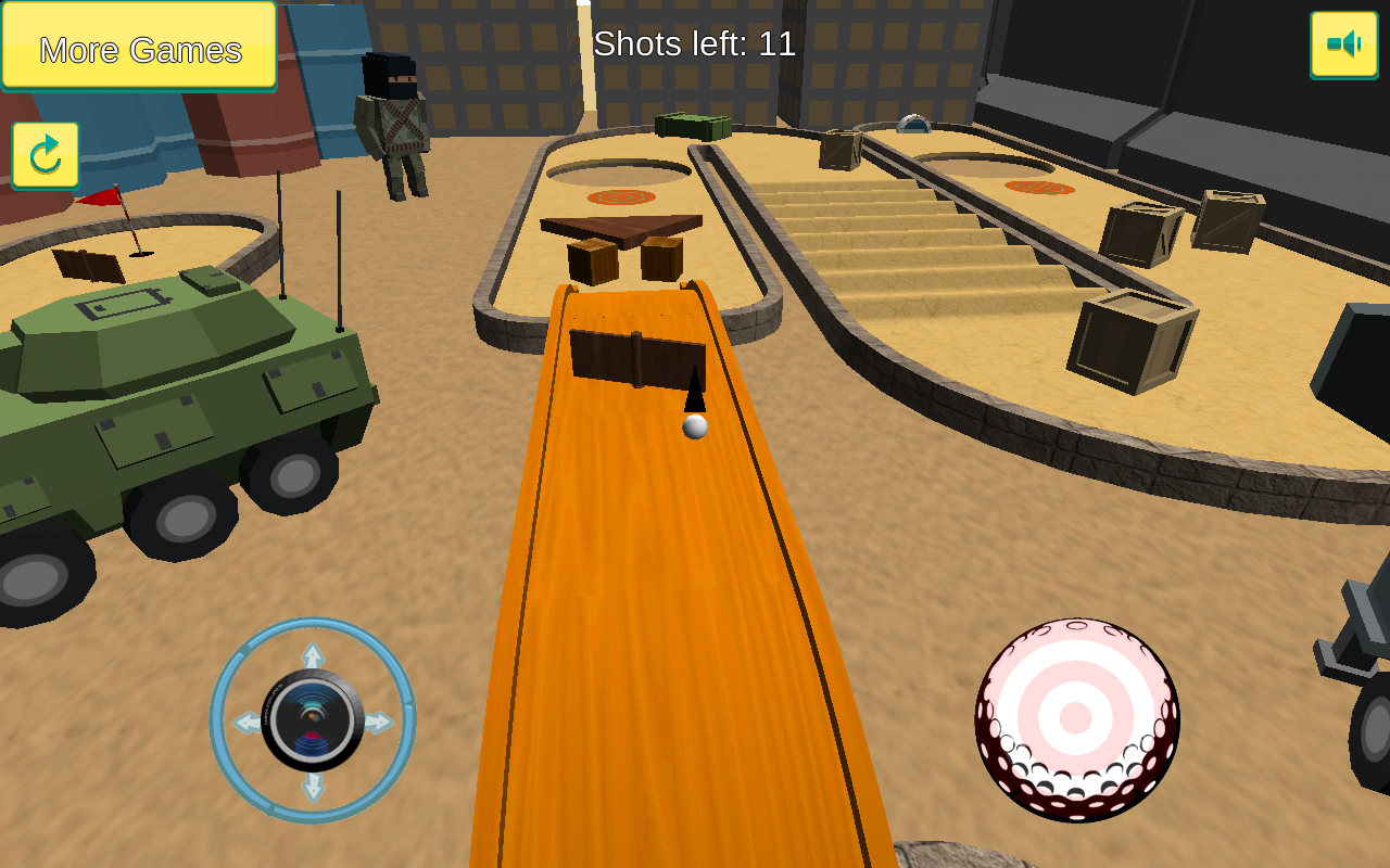 あなたの目的はボールを打つことです。障害物を回避または使用して有利に。ジャンプパッド、スロープ、地面の穴、その他多くの機能を備えており、スポーツを楽しむことができます。すべてのレベルの最後までゴルフボールを打って、軍事史上最高のプレイヤーになることができますか?時間だけが教えてくれます。