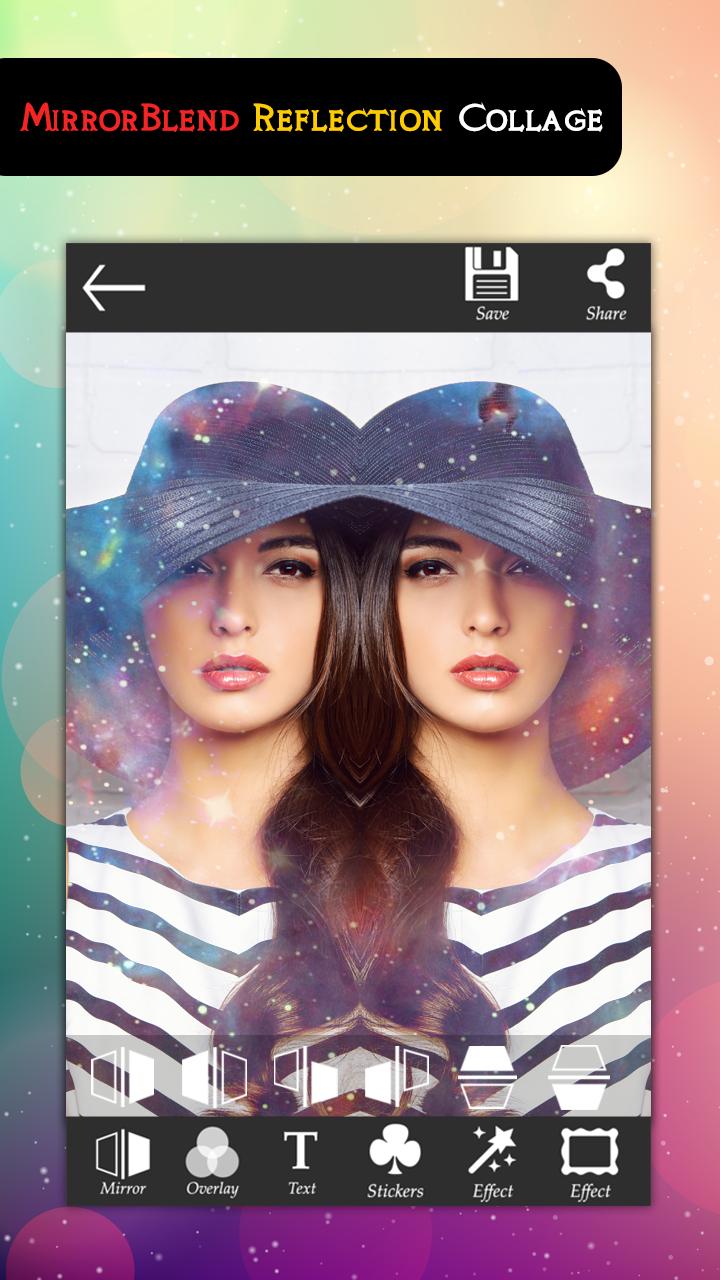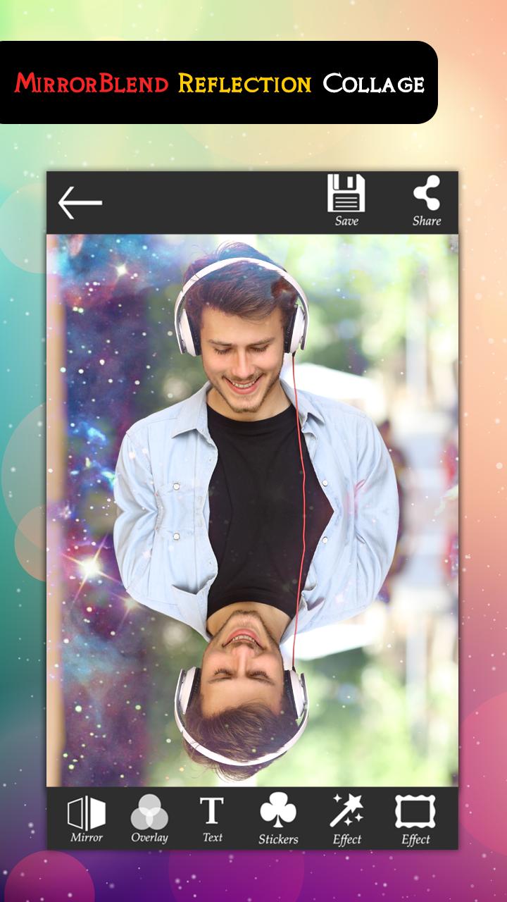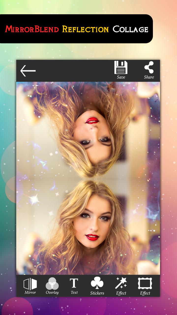 Multiple reflection types you will find here like top, bottom, let, right. Give unique overlay effects to your images and make pics more cool. Add text to your images and be more creative. Add funny stickers anytime.