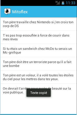 Ce n’est pas toujours facile de trouver l’inspiration, c’est pourquoi MitoFlex vous fait gagner du temps en vous proposant d’innombrables et différents messages sur un ton humoristique, décalé ou tout à fait sérieux. Profitez de la fonction de copié/collé pour insérer facilement les phrases/citations proposées dans vos applications de messageries préférées (Facebook, WhatsApp, Twitter, etc.) ou les envoyer par SMS.