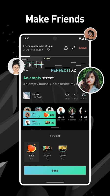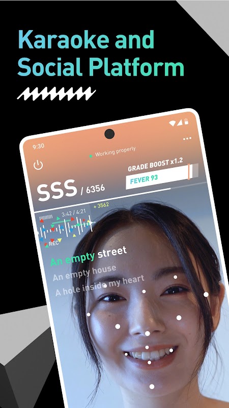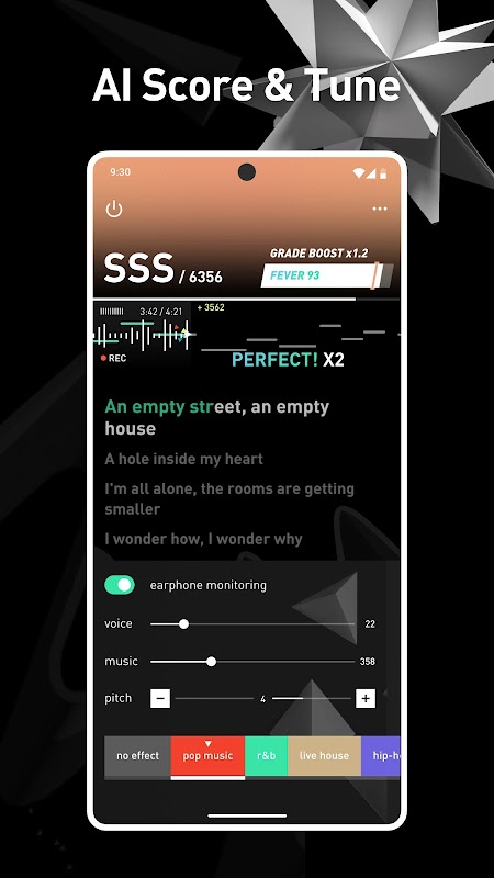 **AI スコア & チューン** 高度な AI スコアリング、強力な音声補正機能、およびさまざまなプリセット効果音を使用して、いつでも高品質な曲を録音できます。