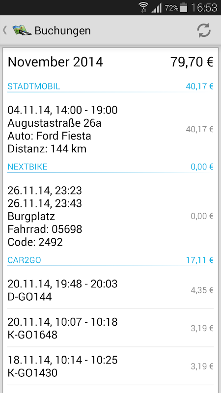 Also we help you to control your monthly mobility costs with the booking overview. All bills are shown for the past 2 months to help you see how much you spend exactly.