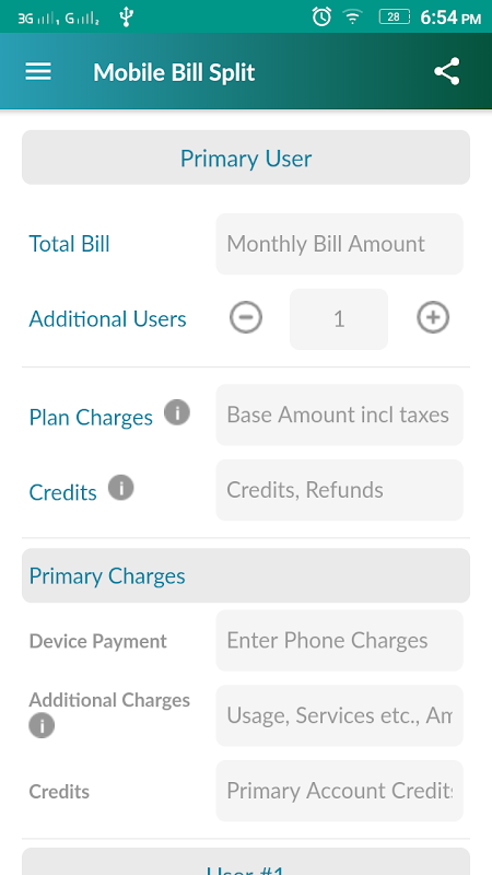 Use MoBill Split to easily split by entering the bill details with base plan charges, user charges, device charges. It automatically calculates the individual share of each user. If you have a credit card transaction to be split between family and friends with interest rate, it will let you know what each user share is based on the no.of days that transaction was charged to credit card.