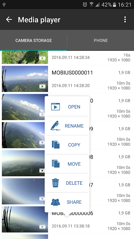 Supported cameras are Mobius ActionCam, Mobius 2, Mobius Mini and 808#16.
