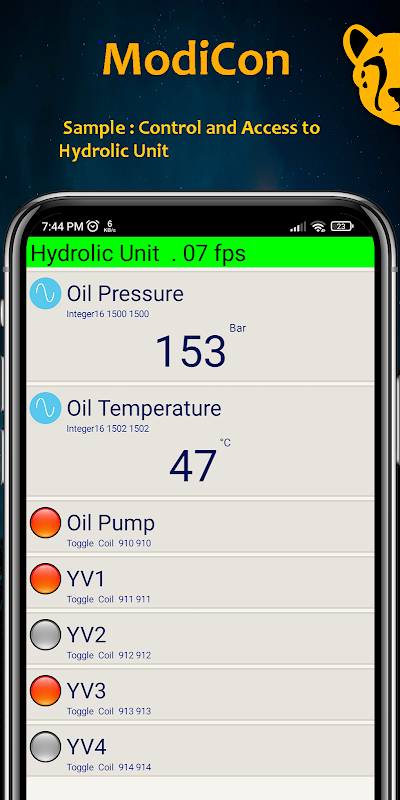 ModiCon can connect Android Devices to Modbus-tcp Equipment as client. Modbus-tcp Equipment like Plc connect to modem-router directly and then app ready to network connection , if router connect to internet app can connect over internet . app have 4368 Programmable tags in 3 Layer (Input,Coil, Register and menu) Layer 1 have 16 tags each contain 16 tag in Layer 2 each contain 16 tags in layer 3.the user can design the human machine interface on Android phone.