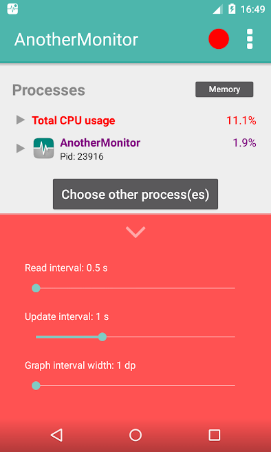 Android 7.0では、Googleは文書化されていない変更を行い、procファイルシステムへのアクセスを大幅に制限しました。これは、この新しいAPIレベル以降、プロセス情報を取得できなくなることを意味します。 Android 7.0を搭載したデバイスで実行されているAnotherMonitorは、合計CPU使用率、AnotherMonitor CPU使用率、メモリ使用率のみを表示しますが、他のプロセスのCPU使用率は表示しません。ルート化されたデバイスでアプリを実行しても違いはありません。