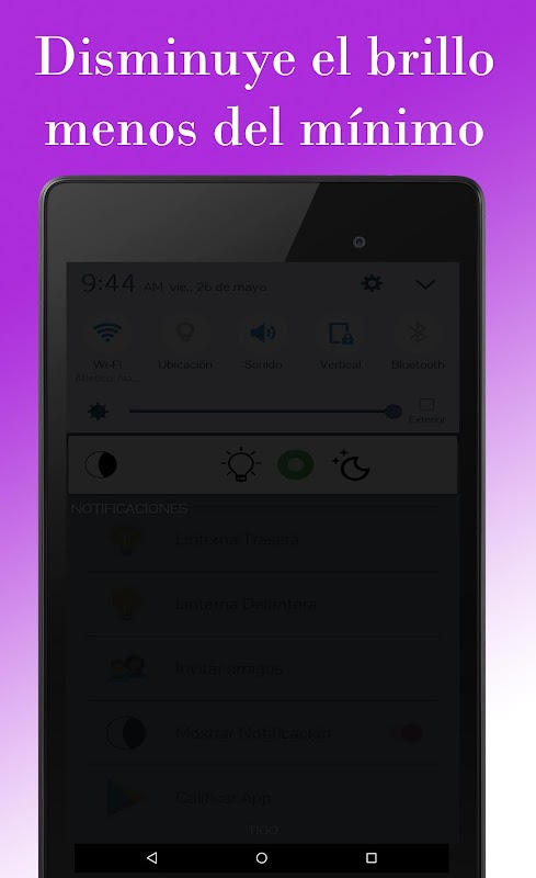 MoonScreen una aplicación que une dos funcionalidades que nunca pueden faltar en la cual puedes controlar el brillo de pantalla disminuyéndolo al máximo para que puedas disfrutar en las noches del uso del dispositivo y no hacerte daño en la vista ademas ahorra la energía de la batería porque la pantalla es la que mas corriente consume.