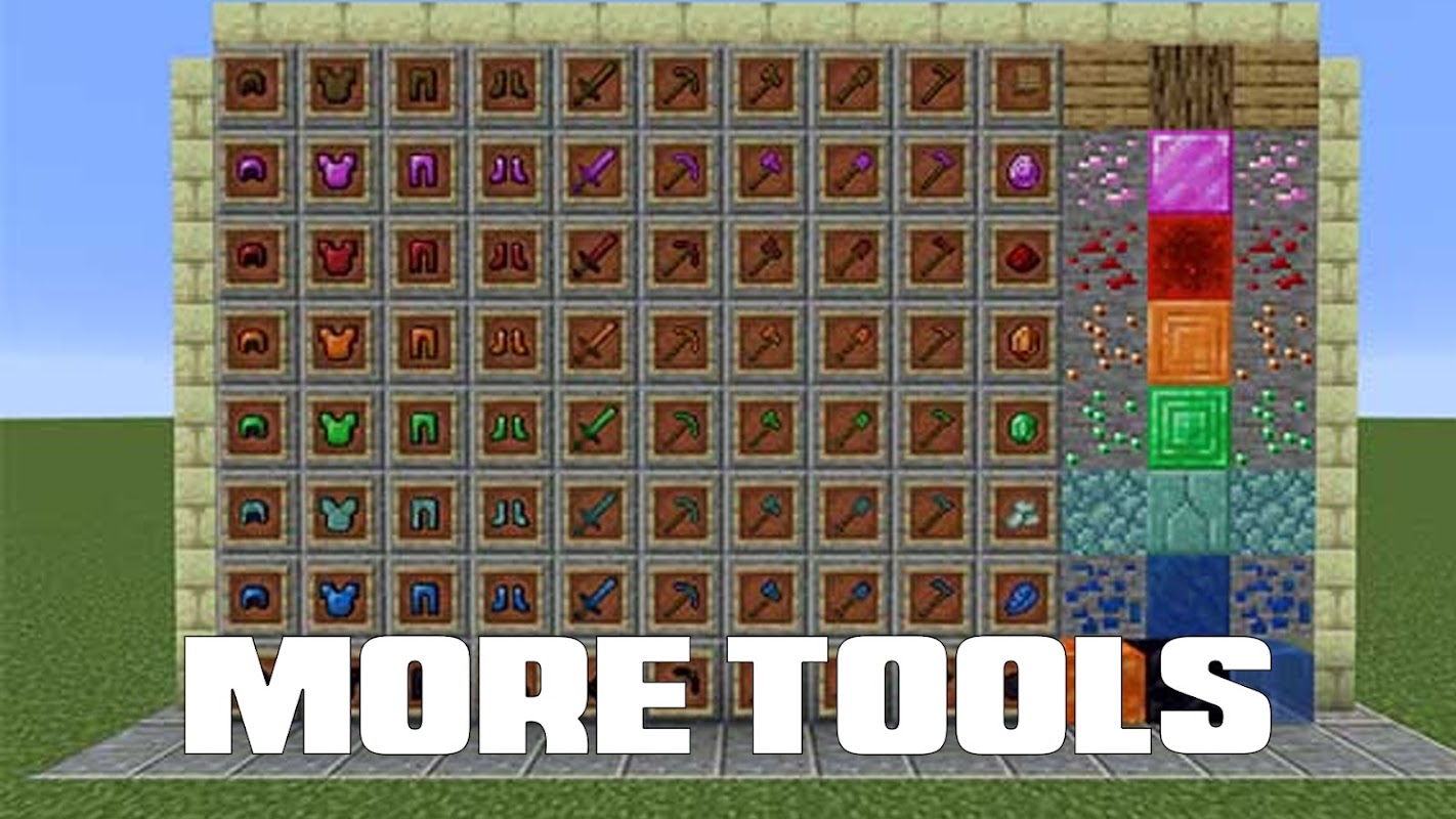 More tool mod for mcpe will add a large number of more tools to the game for every taste! Ruby Pickaxe or Violet Sword is now in the game and another instruments! And you can fully experience them, as well as the multi-tools that you can craft from the expensive metals for instruments and jewels in mcpe you find in the mine! Travel more underground alone or with friends and find treasures to create more tools and instruments. The mod's tools are very durable and versatile, you can also enchant them and play with your friends and mcpe mod by arranging a duel on sapphire swords!