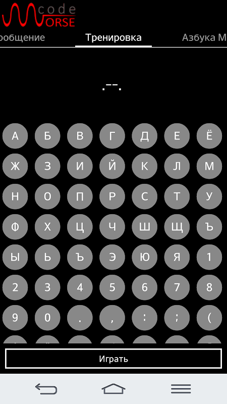 • Тренировка - в этом режиме предлагается поэтапно изучать символы Морзе, каждый раз увеличивая знания и просматривая результаты. С изучением каждого символа в тренировке Морзе открывается новый символ для изучения