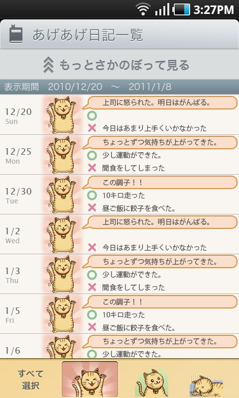 『あげあげ日記帳』は、毎日の日記の記録を楽しく、そして、自分の過去の気分や状況がひと目でわかるようになっており、最近調子がいいか、不調な日々が続いているかがかんたんにわかります。さらに、気分毎の日記一覧表示も可能なので、過去の内容を振り返り、今後に活かすことができます。