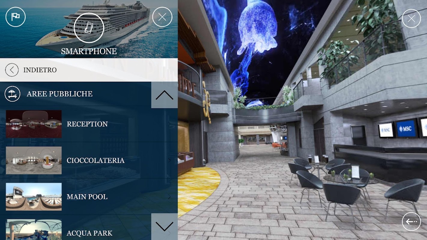 MSC360EXPLOREを持つユーザーは、目的地や小旅行には、そのような船のケータリングやプールなどの環境のために、MSCに対して360°の角度に映像コンテンツとレンダリング環境で、スマートフォン、タブレットおよび/または段ボールを通じてMSCの世界を表示することができます、等...