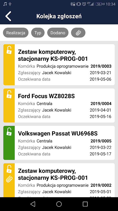 •サービス技術者に割り当てられている現在のレポートのリスト(ERPシステムデータベースに保存されている)へのアクセス。種類(失敗、損傷、検査)、ステータス(オープン、一時停止、拒否、クローズなど)でフィルタリングできます。