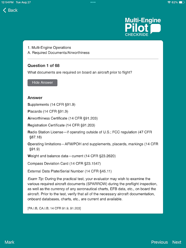 • 各質問には、さらなる学習のための航空従事者認定基準 (ACS) コードと FAA の参考資料が含まれています。