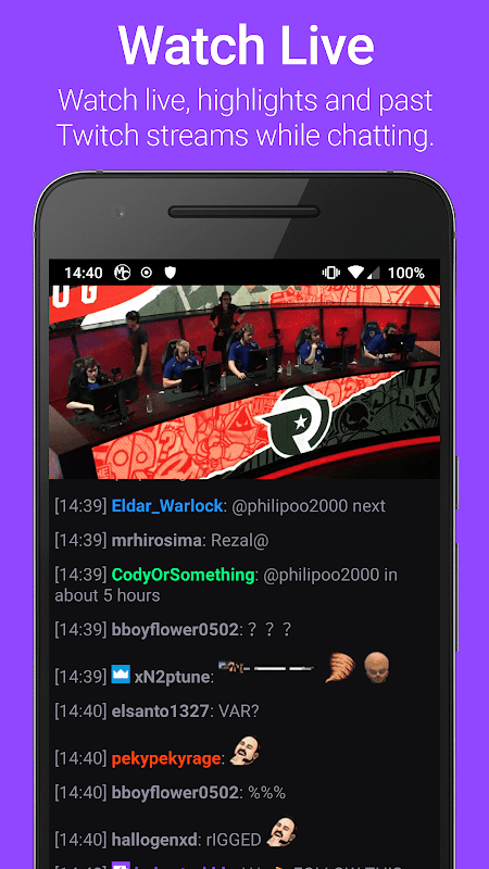 • Watch a live Twitch stream in-app while chatting. You can also watch previous streams, highlights and clips. Swipe the screen to watch one channel while reading the chat of another.