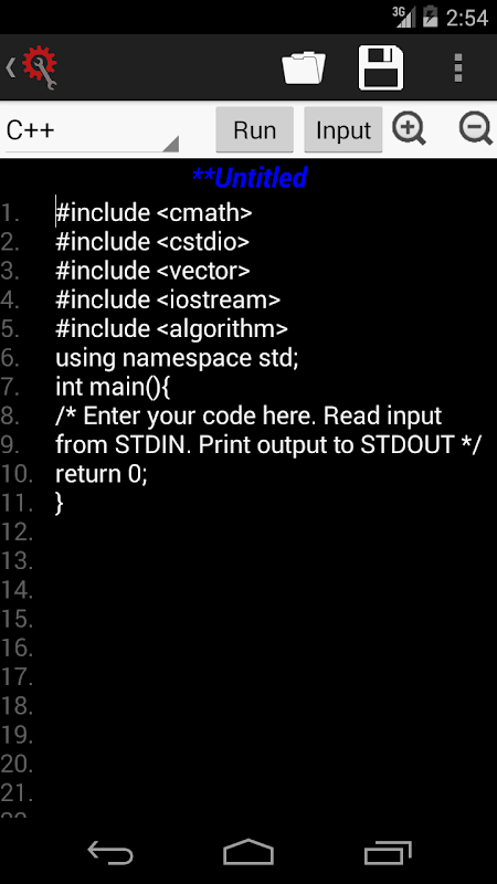 • Inbuilt templates and inclusion of library files for each language; user need not type them explicitly. Upon selecting the desired language the template will automatically load in the editor.