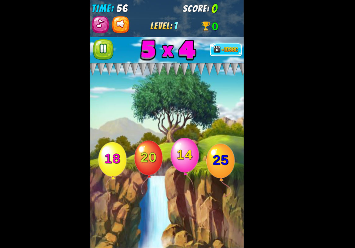 与えられた掛け算の正解を見つけ、時間内に正解の風船を割ってスコアを上げましょう。