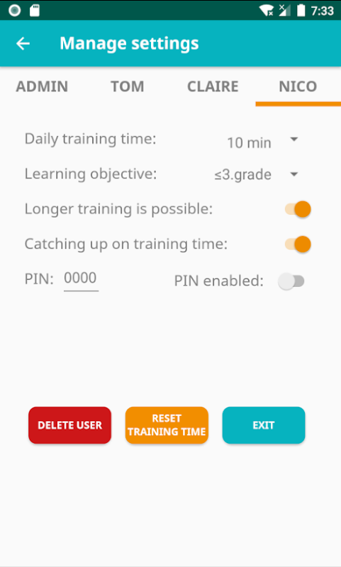 By means of an Admin PIN the settings can be protected. The functionality of the "KickStart-Math-App" methodology depends on the fact that no other learners train under the same profile. Therefore the admin can also protect the access to the training of the individual learning profiles with an individual PIN.