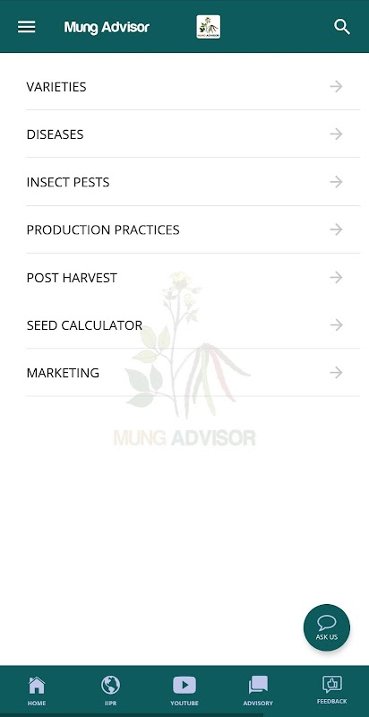 研究所の使命と任務に沿って、「Mung Advisor」は、一般大衆と農民に、リョクトウ栽培に関する情報の包括的なパッケージを提供するAndroidアプリとして開発されました。これは英語とヒンディー語のバイリンガルアプリで、改良された品種、文化的慣行、作物管理、害虫や病害、収穫後の技術、マーケティングなどに関する州および季節固有の情報を提供します。の最新の統計、栄養情報天気予報もアプリの不可欠な部分ですが、「レシピ」のセクションでは、緑豆から調製することができるおいしそうな料理について説明します。これは、農民が彼らの直面している問題に関連する質問を緑豆栽培で行うことができ、農民もそれを診断ツールとして使用し、文章や写真の形で彼らの懸念をアップロードできるインタラクティブアプリです。リアルタイムベース将来的には、フィードバックに基づいてこのアプリをより堅牢で適切なものにするための情報を追加し、国のさまざまな州のすべての緑の農家のニーズに応えることを多言語化します。それはこのアプリは、国内の緑豆栽培に関連するすべての問題へのワンストップソリューションを提供することが期待されています。
