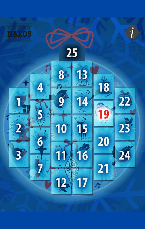 Naxos’s second musical app for Advent features 25 complete tracks behind numbered doors. Each day, a new door is ‘unlocked’ to reveal a new piece of seasonal music from Naxos’s classical music catalogue.