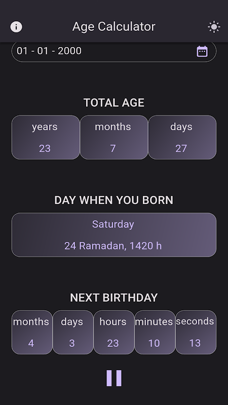 年齢計算アプリへようこそ。これは、人生の節目を祝い、愛する人とのつながりを保つための究極のツールです。私たちのアプリは単に年齢を計算するだけではなく、それぞれの誕生日を大切な思い出にするための機能を独自に組み合わせたものです。あなたが生まれた曜日を発見し、ヒジュラ語の誕生日の美しさを探ってください。次の誕生日までのカウントダウン タイマーを使えば、もう重要な日を逃すことはなくなり、また楽しい一年を迎える準備ができています。しかし、それだけではありません。家族や友人の誕生日を保存して管理できます。また、私たちの思慮深い通知システムにより、あなたの幸運を祈ることを忘れることはありません。私たちと一緒に人生を祝い、瞬間を捉え、大切な人とのより強い絆を築きましょう。